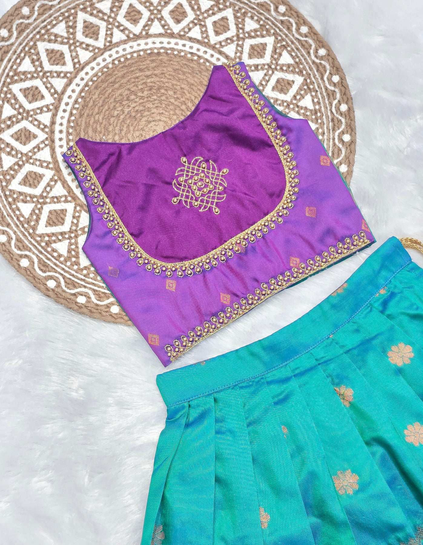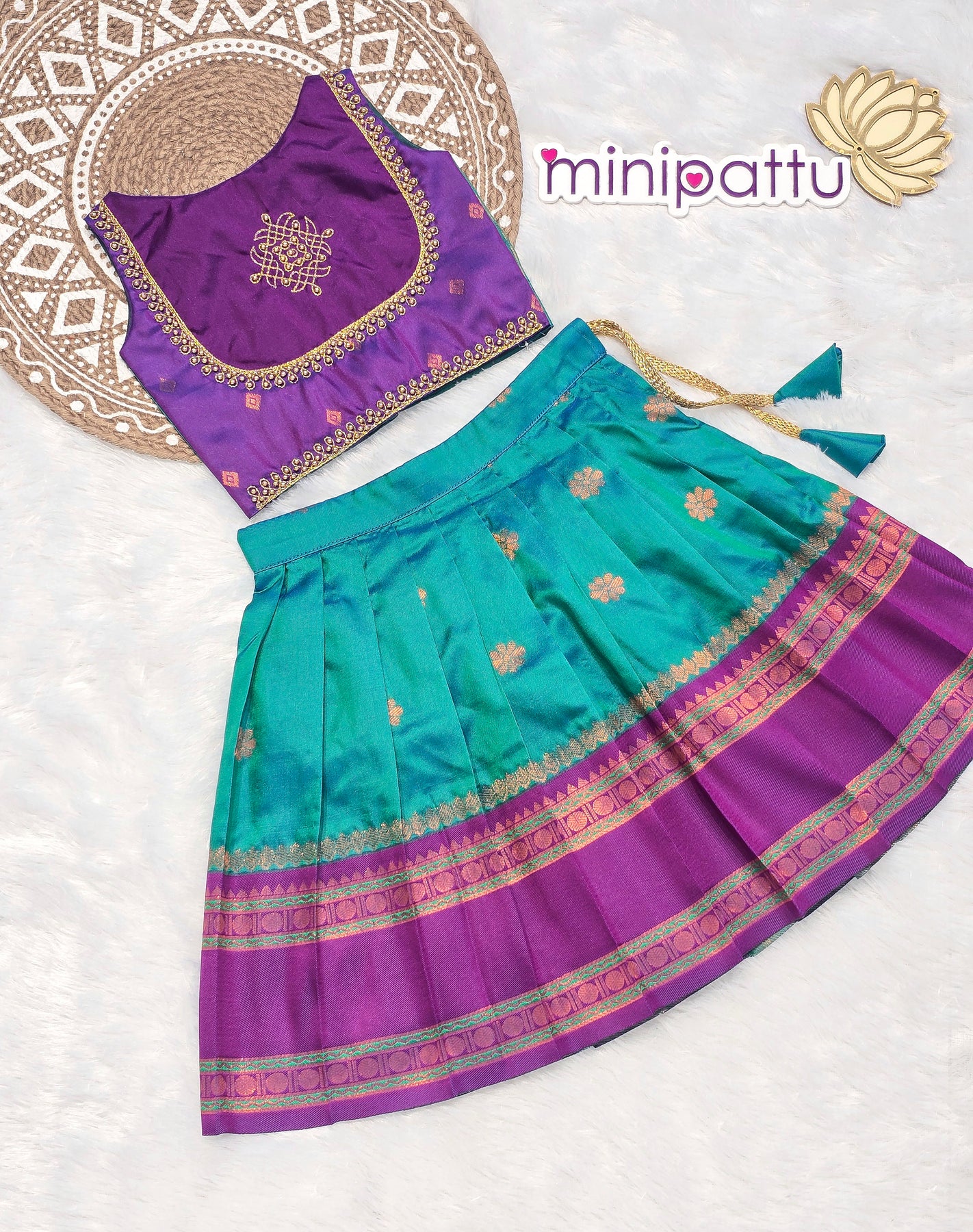 | Color: | Namratha - Violet Teal Blue Designer Minipattu |