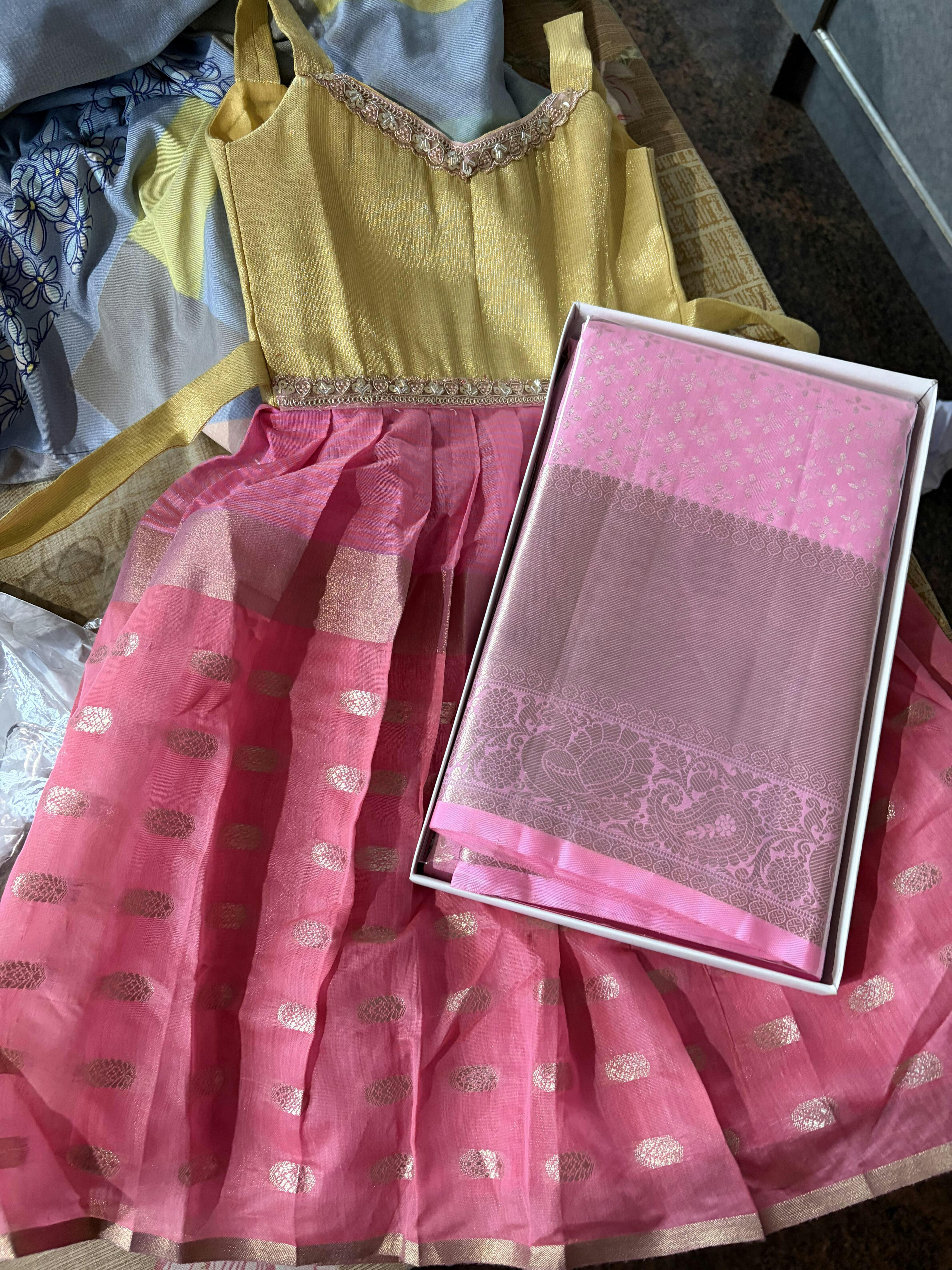 | Color: | Aadhya -Pink Tissue Frock Minipattu |