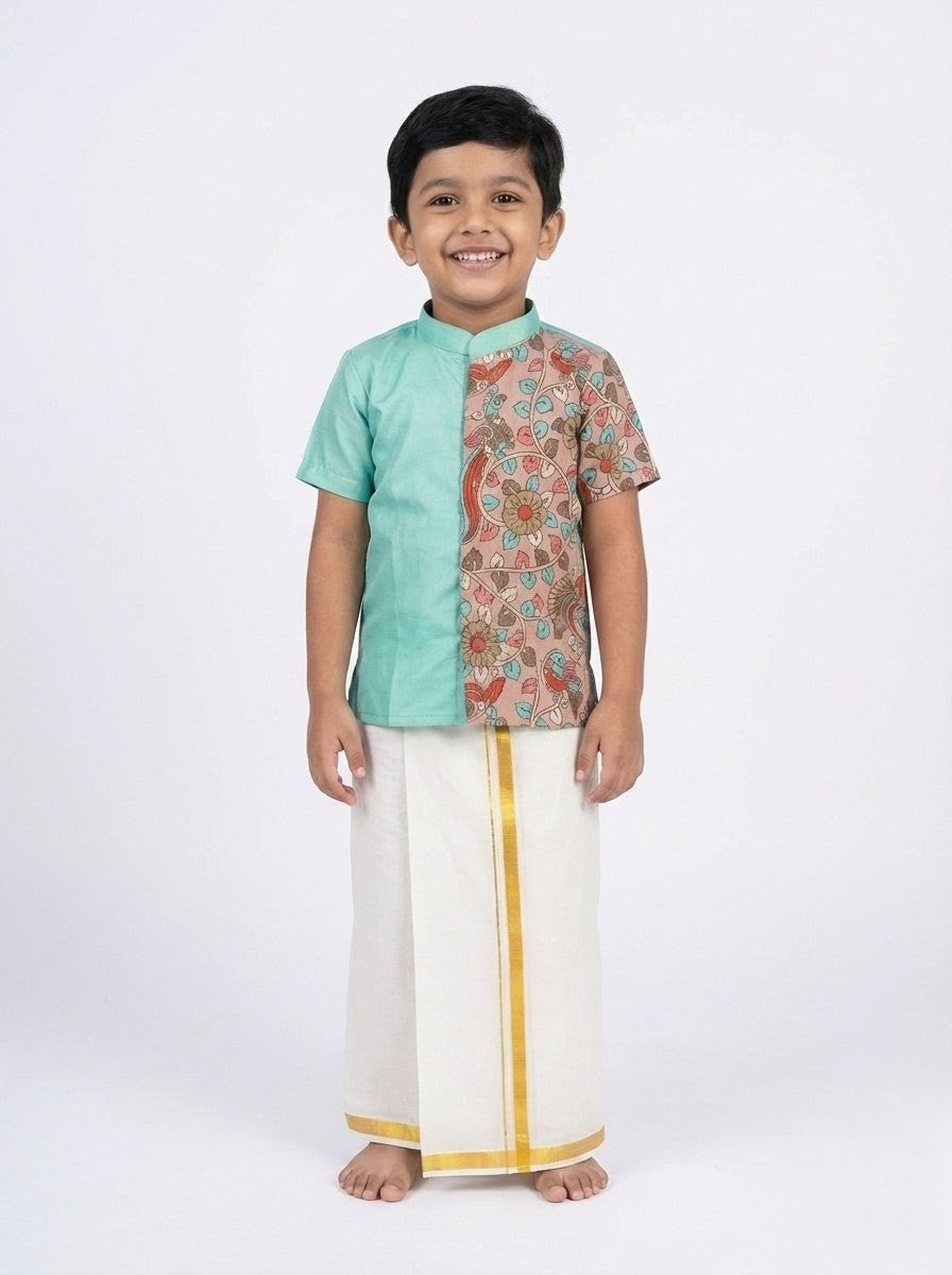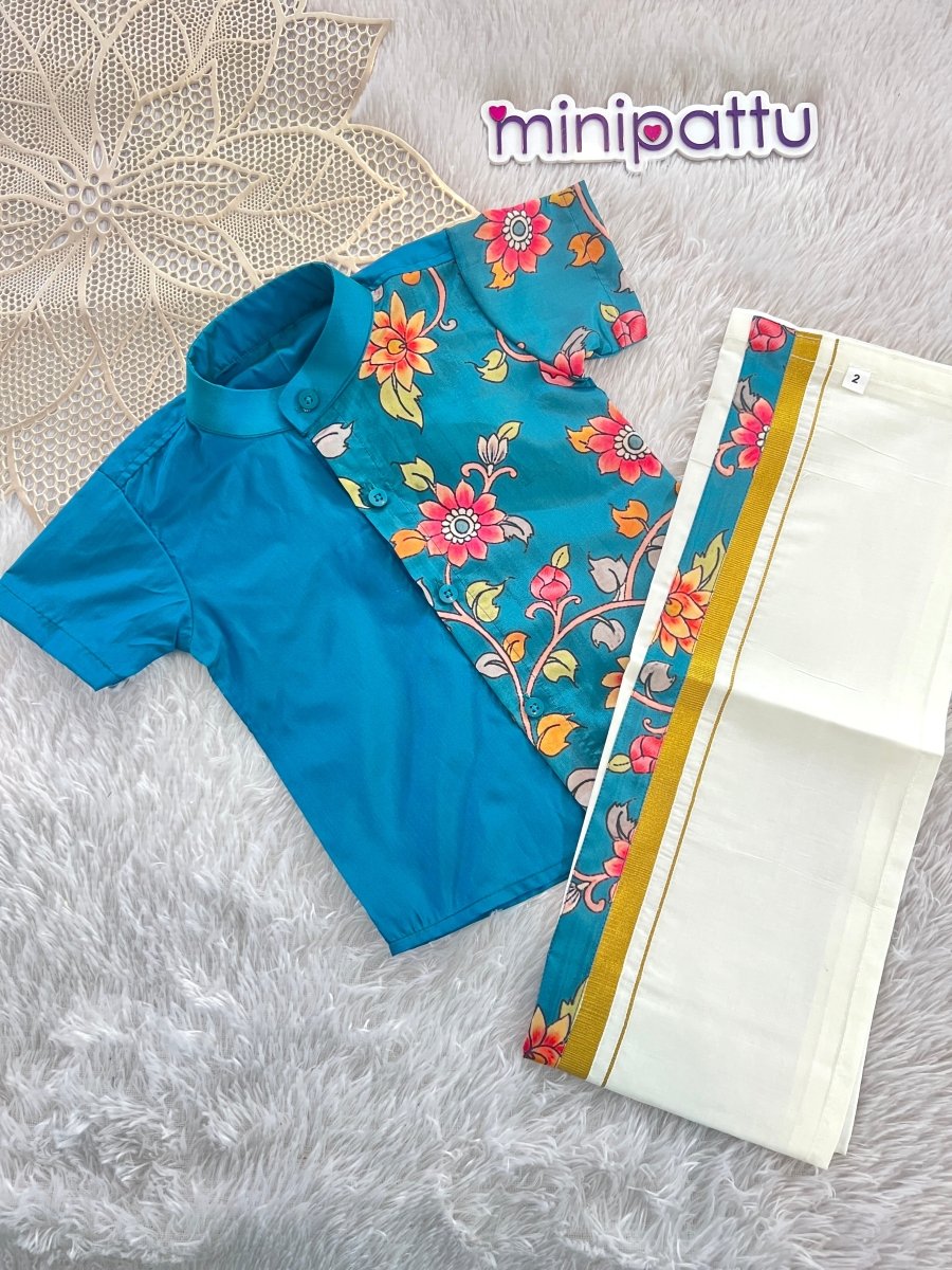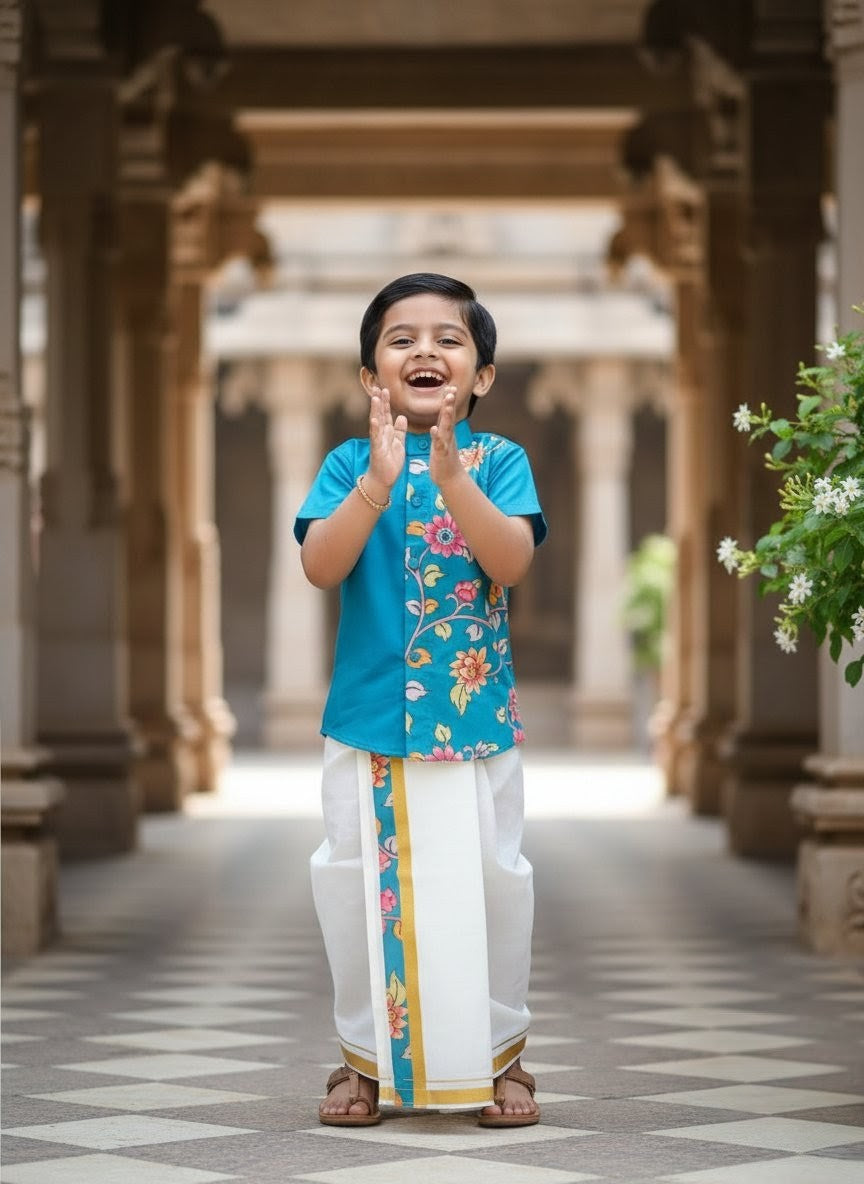 Yathra - Teal Blue Kalamkari Kurta Shirt & Dhothi Set