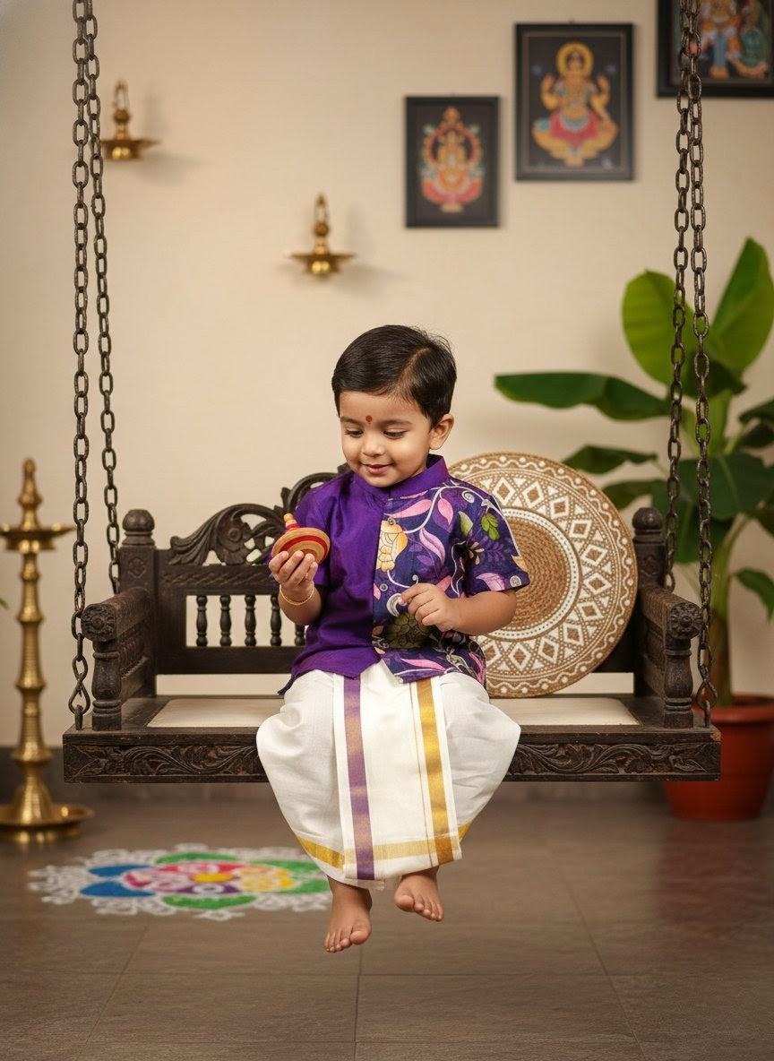 Tharun - Violet Kalamkari Kurta Shirt & Vesti Set