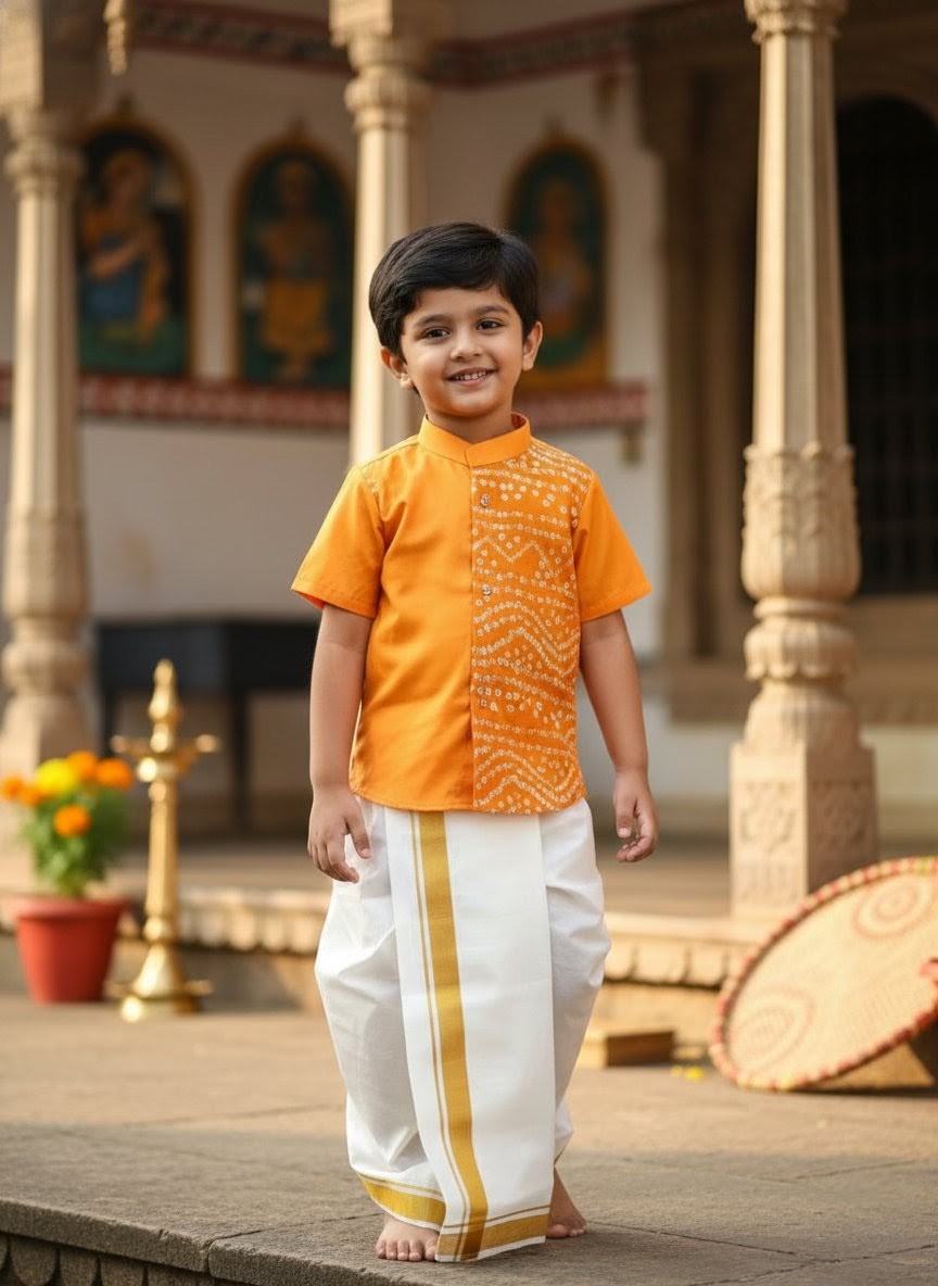 | Color: | Yathra -Musturd Bandhini Shirt & Dhothi Set |