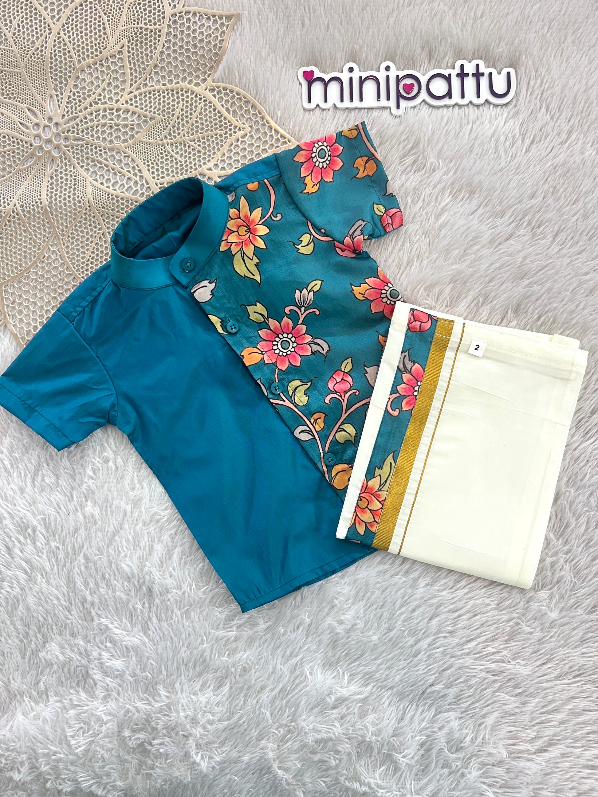 Color: | Yathra - Teal Blue Kalamkari Shirt & Dhothi Set |